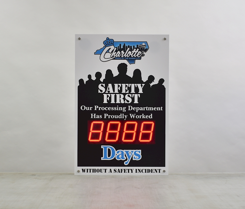 Many people subscribe to the philosophy of, “What gets measured, gets done."  An organization that promotes safety performance daily demonstrates that safety is valued. An effective way to promote your safety metrics is with this 36" high by 24" wide safety scoreboard with integrated 5" LED safe days counter.  The four digit day counter will automatically update the current count by one each night at midnight so you don't need to worry about updating the sign each workday.