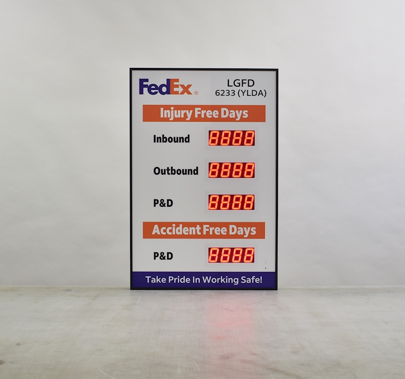 With so many programming options you can make this counter display just about anything. The most common use for this counter is to track safe days worked, but we've had people use this counter to track days until a project deadline, number of environmental incidents, static price display, and many more. The logic is simple. Tell the sign how often you want to count, what direction to count, and how much to count by each time it counts. Then simply set a current count, and the counter will begin following your instructions. The configuration is stored in flash memory so if the power goes out, you won't need to reconfigure it.