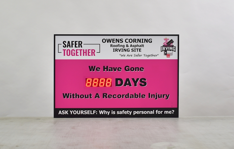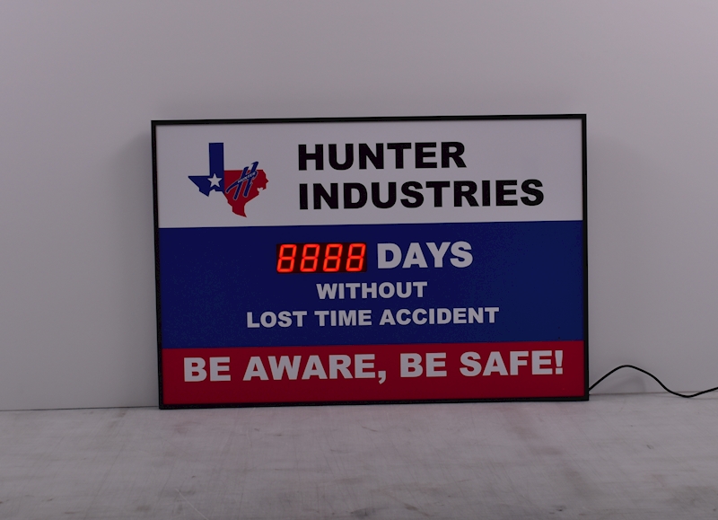 With so many programming options you can make this counter display just about anything.  The most common use for this counter is to track safe days worked, but we've had people use this counter to track days until a project deadline, number of environmental incidents, static price display, and many more. The logic is simple.  Tell the sign how often you want to count, what direction to count, and how much to count by each time it counts.  Then simply set a current count, and the counter will begin following your instructions.  The configuration is stored in flash memory so if the power goes out, you won't need to reconfigure it.