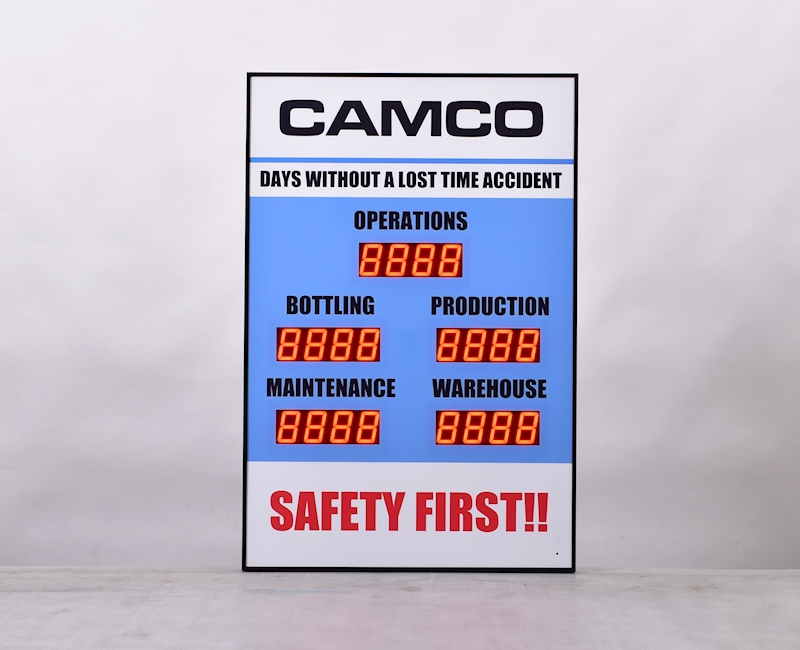 daily demonstrates that safety is valued. Everyone will be looking at this 36" high by 24" wide custom safety scoreboard with five counter displays.  Whether you track safety metrics by shift, department, or team this sign can be customized online to your needs.