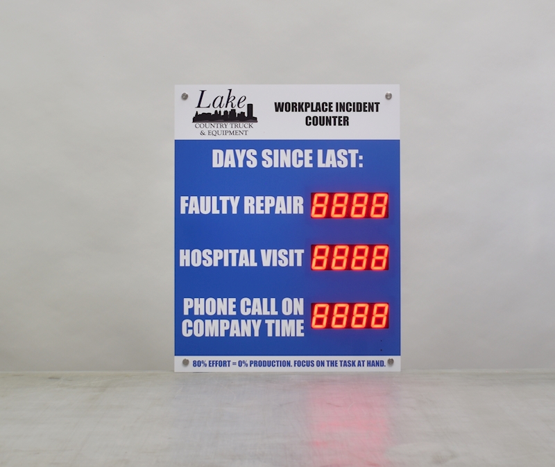 We all know what happens when safety isn't prioritized. When leaders don't embrace safety, accidents happen and workplace morale plummets.  This lost time accident scoreboard is a great way to reinforce company safety culture and keep everyone focused on returning home safely.  With three counters you have the option to track accident free days for three separate departments or two departments and a record.  Inspire competition between work groups or just raise awareness for all. These 2.3" digit displays are highly visible and will automatically advance daily.  With dimensions of 28 inches high by 22 inches wide this sign should fit nicely just about anywhere and provide a nice visual cue to remind employees to stay focused on safety.