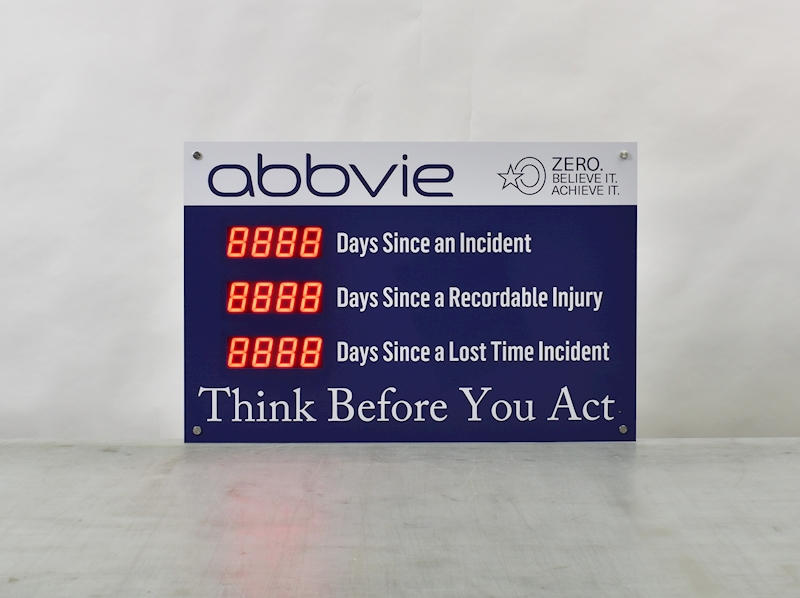 With so many programming options you can make this counter display just about anything.  The most common use for this counter is to track safe days worked, but we've had people use this counter to track days until a project deadline, number of environmental incidents, static price display, and many more. The logic is simple.  Tell the sign how often you want to count, what direction to count, and how much to count by each time it counts.  Then simply set a current count, and the counter will begin following your instructions.  The configuration is stored in flash memory so if the power goes out, you won't need to reconfigure it.