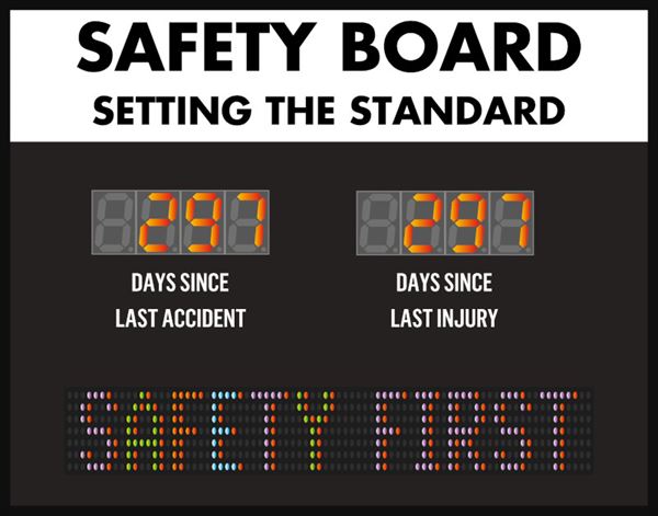 With so many programming options you can make this counter display just about anything.  The most common use for this counter is to track safe days worked, but we've had people use this counter to track days until a project deadline, number of environmental incidents, static price display, and many more. The logic is simple.  Tell the sign how often you want to count, what direction to count, and how much to count by each time it counts.  Then simply set a current count, and the counter will begin following your instructions.  The configuration is stored in flash memory so if the power goes out, you won't need to reconfigure it.