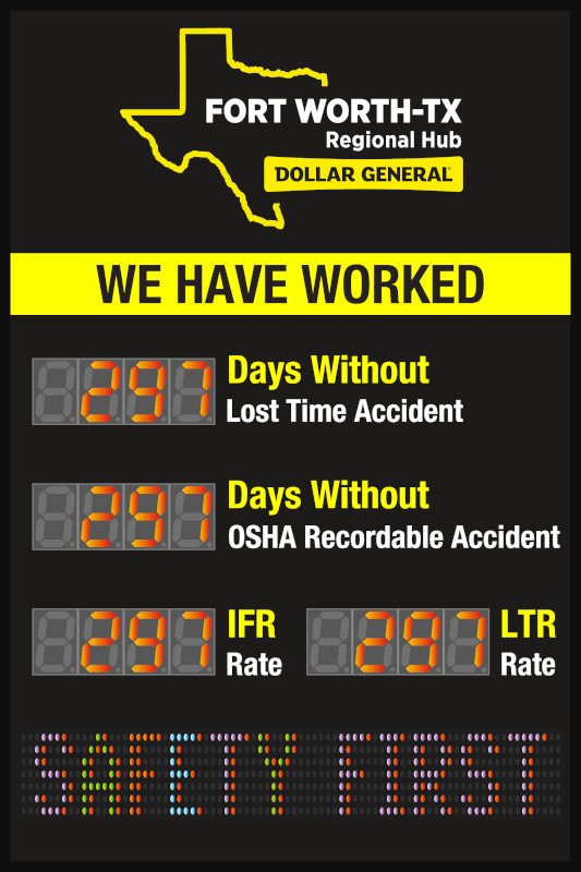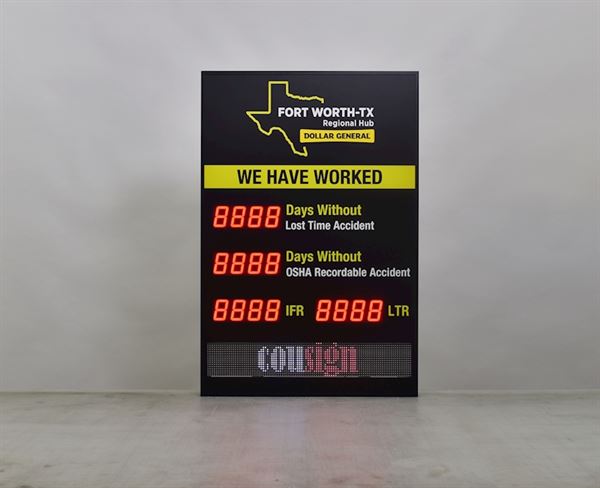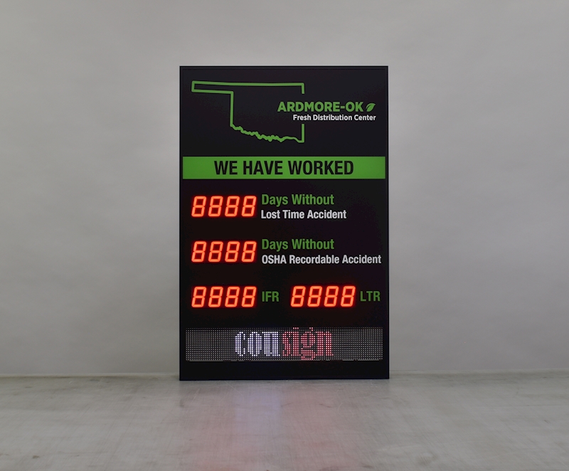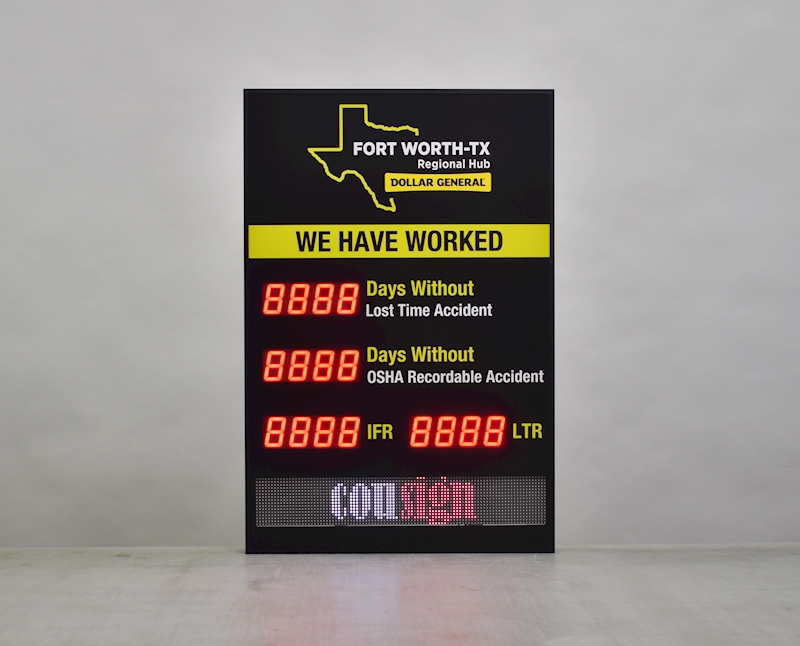 36"h x 24"w Safety Sign with Four 2.3" Displays and scrolling marquee.
