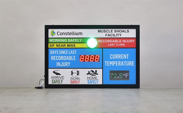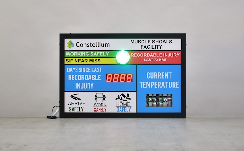 24"h x 36"w safety scoreboard Sign With One 2.3" numeric display, One 4" multicolor light and 4" temperature display