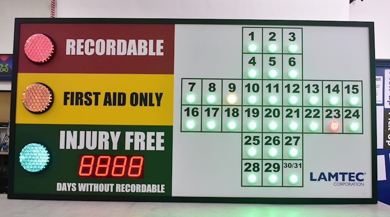 The safety cross is a special version of the firmware for the multicolor controller that allows up to 30 lights to be controlled in a safety cross pattern. The lights can be set to a color to denote the safety status for the day or denote days of significance in the future such as a monthly or weekly safety meeting. For example, for each incident free day in the current month you can set the light to green. On any day where a near miss occurs the light can be set to yellow and if a reportable accident occurs the light for that day can be set to red. Safety meetings for the month can be denoted in