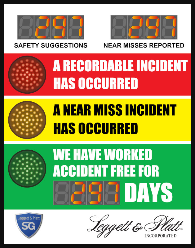 28"h x 22"w Safety Scoreboard with three 2.3" Day Counters and 4" Red/Yellow/Green Stoplights